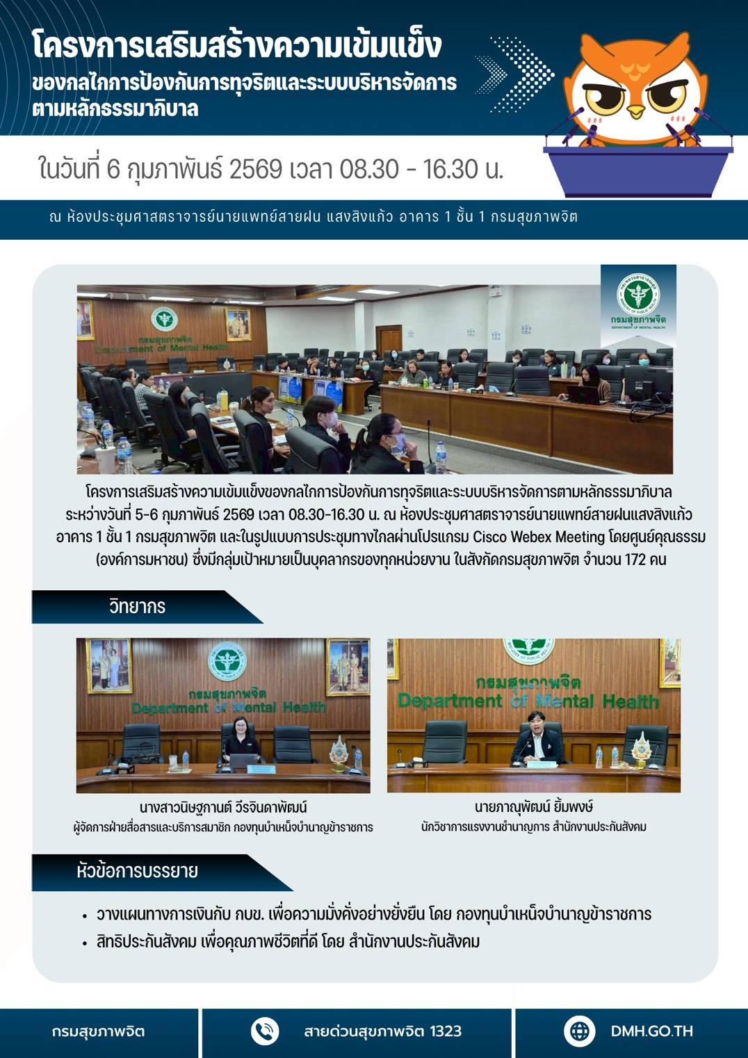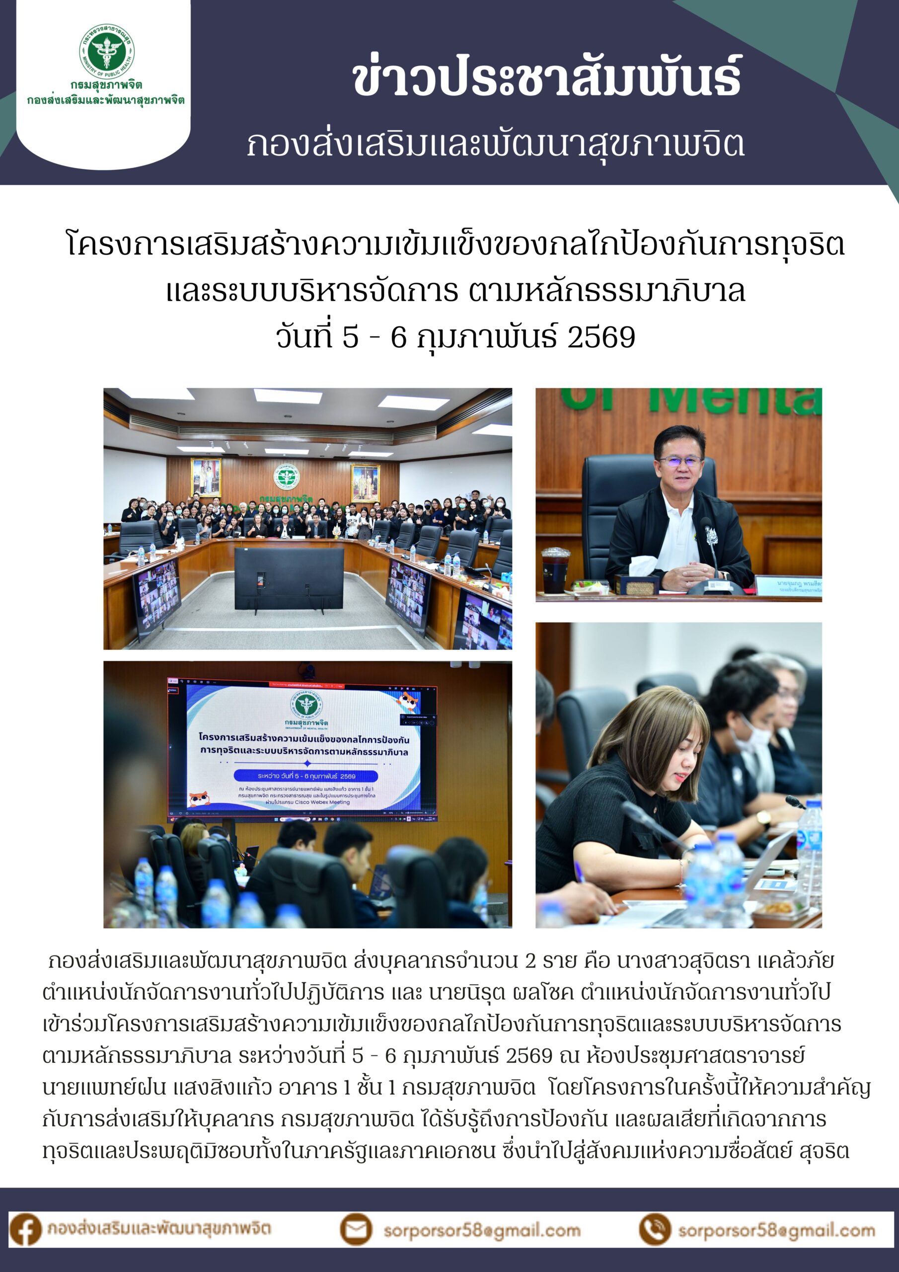 โครงการเสริมสร้างความเข้มแข็งของกลไกการป้องกันการทุจริตและระบบบริหารจัดการตามหลักธรรมาภิบาล วันที่ 5-6 ก.พ. 69 ณ ห้องประชุม 1 กรมสุขภาพจิตBy / 9 กุมภาพันธ์ 2569 จำนวนผู้เข้าชม: 9