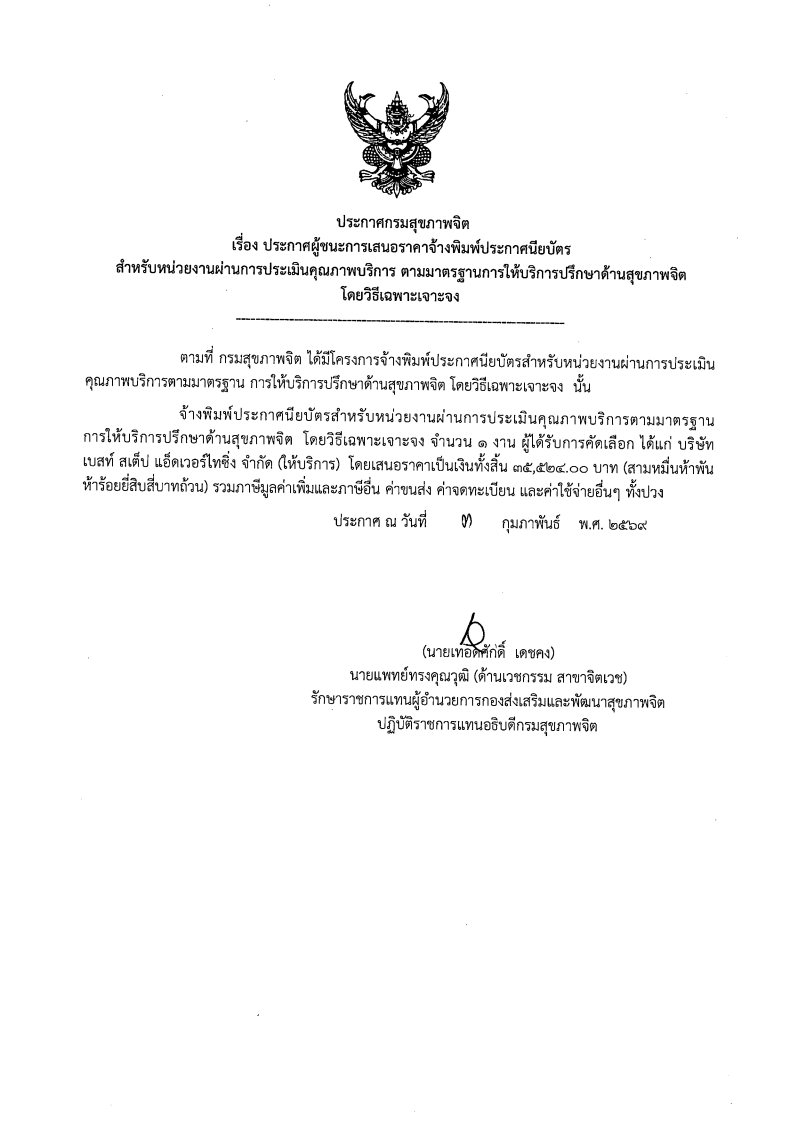 ประกาศกรมสุขภาพจิต เรื่อง ประกาศผู้ชนะการเสนอราคาจ้างพิมพ์ประกาศนียบัตร สำหรับหน่วยงานผ่านการประเมินคุณภาพบริการ ตามมาตรฐานการให้บริการปรึกษาด้านสุขภาพจิต โดยวิธีเฉพาะเจาะจงBy / 3 กุมภาพันธ์ 2569 จำนวนผู้เข้าชม: 15