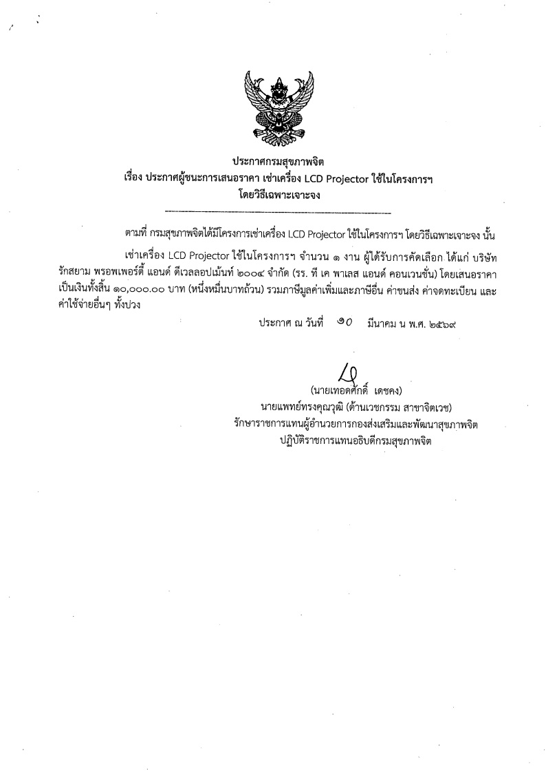 ประกาศกรมสุขภาพจิต เรื่อง ประกาศผู้ชนะการเสนอราคา เช่าเครื่อง LCD Projector ใช้ในโครงการฯ โดยวิธีเฉพาะเจาะจงBy / 10 มีนาคม 2569 จำนวนผู้เข้าชม: 25