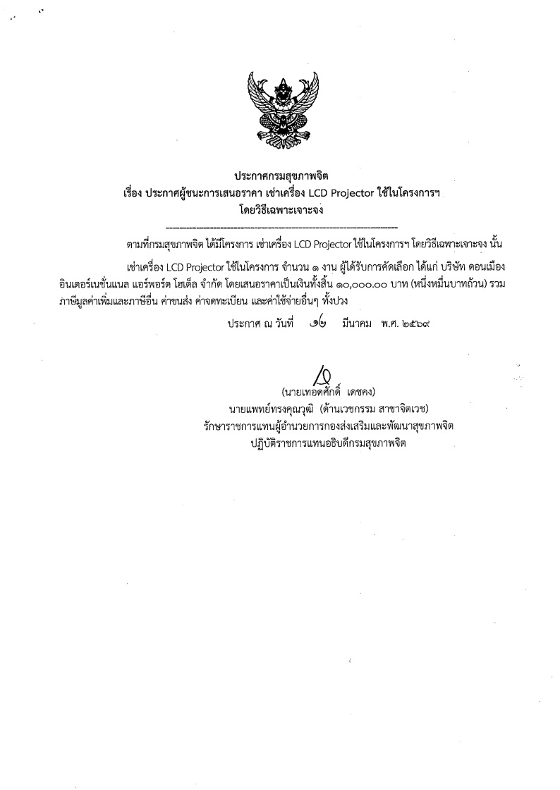 ประกาศกรมสุขภาพจิต เรื่อง ประกาศผู้ชนะการเสนอราคา เช่าเครื่อง LCD Projector ใช้ในโครงการฯ โดยวิธีเฉพาะเจาะจงBy / 12 มีนาคม 2569 จำนวนผู้เข้าชม: 30