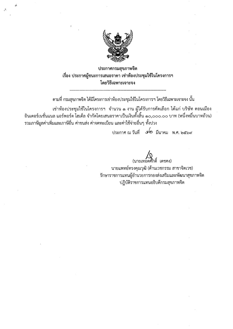 ประกาศกรมสุขภาพจิต เรื่อง ประกาศผู้ชนะการเสนอราคา เช่าห้องประชุมใช้ในโครงการฯ โดยวิธีเฉพาะเจาะจงBy / 12 มีนาคม 2569 จำนวนผู้เข้าชม: 29